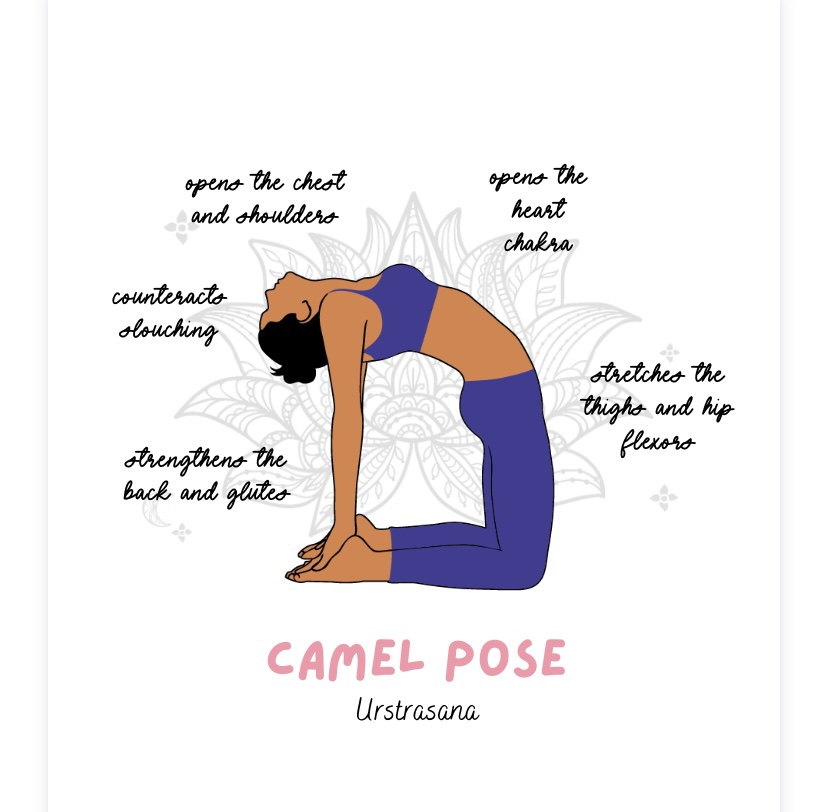 A research review indicated that too much time sitting down plays a role in reducing the metabolism and restricting blood flow through the body. Exercise helps address these deeper concerns. Flexing and extending your spine with Camel Pose is going to: